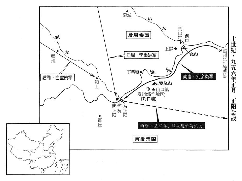 2、南唐援军统帅刘彦贞(参考九五五年十一月),一生荣华富贵,对人态度傲慢,既没有才干智略,也不懂军事,历任战区司令官,只知道贪赃枉法,累积的家财高达亿万之多,用来贿赂当权重要人物,因此宰相魏岑等对他互相争着称赞,认为他治理民众的能力犹如龚遂(参考前六六年十二月)、黄霸(参考前五五年二月),指挥大军作战的能力好像韩信(参考前二〇六年七月)、彭越(参考前二〇七年二月),所以后周军队南下,南唐帝(二任元宗)李璟(徐景通)首先起用他担任统帅,刘彦贞的部将咸师朗等都是粗汉,没有智谋,只有勇敢。听到李穀撤退消息,大为欢喜,率军直抵正阳(东正阳·安徽省寿县西南正阳关“〔淮河东岸〕”),沿途旌旗招展,辎重车辆连绵,长达数百里。清淮(总部寿州)司令官刘仁赡,及池州(安徽省贵池市)州长张全约,一再劝他停止,刘仁赡强调说:“你的主力部队还没有到,敌人就先逃走,是畏惧你的声威,何必速战速决?万一不太顺利,大事就一去不返。”刘彦贞不接受。大军开拔后,刘仁赡说:“他如果跟对方遭遇,一定失败!”于是增加城防兵力,严密戒备。后周将领李重进渡淮河迎击,在正阳(东正阳)东会战,大破南唐军,斩刘彦贞、生擒咸师朗,杀一万余人,尸体横在路上,长达三十里,掳获物资军械三十余万。当时,江淮一带(华东地区),长期以来,都是太平盛世,人民不习惯战争,刘彦贞失败,南唐全国惊恐,张全约率残兵败将逃奔寿州,刘仁赡上疏推荐张全约当步骑兵左翼总指挥官(马步左厢都指挥使)。皇甫晖、姚凤,退守清流关(安徽省滁州市西北)。滁州(安徽省滁州市)州长王绍颜放弃城池,逃走。