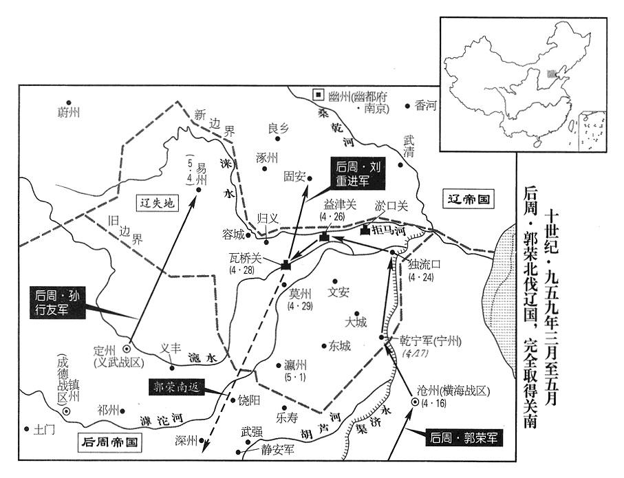 五月一日,皇家侍卫亲军总指挥官(侍卫亲军都指挥使)、天平(总部郓州)司令官李重进等,才率主力大军赶到,辽国瀛州州长高彦晖献出城池投降。高彦晖,是蓟州(天津市蓟县)人。于是,瓦桥关以南失地,全部收复。