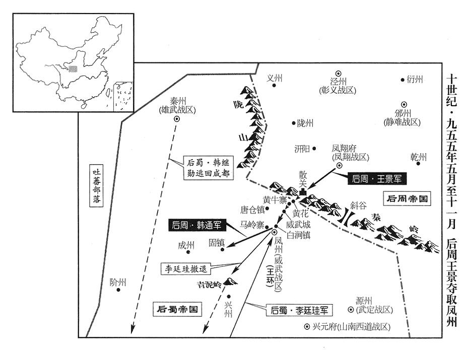 21、后蜀北伐军统帅李廷珪,派先锋总指挥官(先锋都指挥使)李进,进驻马岭寨(陕西省凤县西),又派突击部队穿过斜谷(陕西省太白县境),进驻白涧(陕西省凤县东北);又派军从凤州北方唐仓镇及黄花谷出发,切断后周西征军的粮运路线。