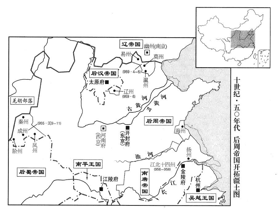 12、后周帝郭荣对宰相们说:“我常常思考怎么才可以把帝国治理好,却得不到要领,即令睡觉吃饭的时候,也都念念不忘。自从后唐、后晋以来,东吴(南吴及南唐)、巴蜀(前蜀及后蜀)、幽州(辽国)、并州(后汉)等地区,分别跟中原隔绝,不能统一。希望中央官员撰写《当帝王固难,当臣属也不易论》,跟《开疆扩土策略》各一篇,给我参考。”