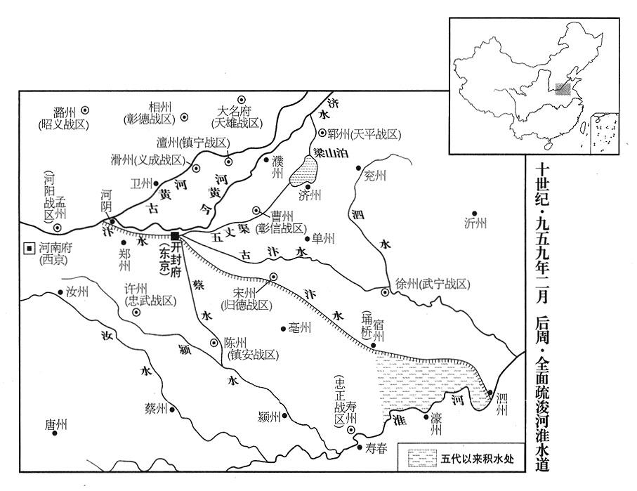 26、汴水(流经河南省开封市南)自从唐王朝末年溃决,自埇桥(安徽省宿州市)东南,积成一片污秽的庞大沼泽。后周帝郭荣计划对南唐进攻,先派武宁(总部徐州)司令官武行德,征调民夫,沿着旧有堤岸修堵疏导,东端直到泗水(淮河支流)。大家议论纷纷,认为很难成功。郭荣说:“几年之后,就可以得到利益。”