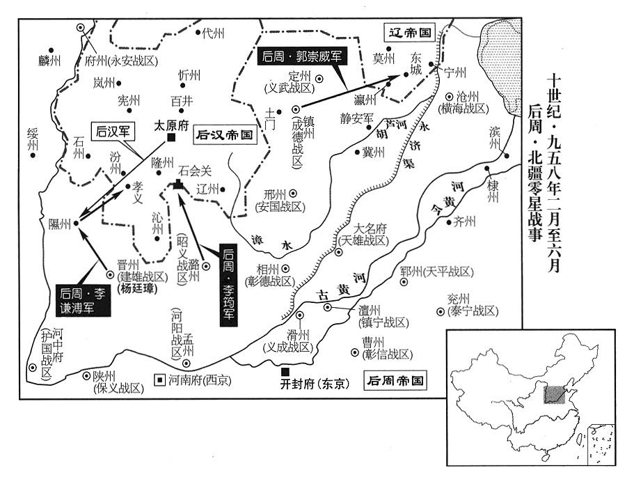 3、辽帝国(首都临潢府“〔内蒙古巴林左旗〕”)自后晋、后汉以来,屡次进攻黄河以北地区,轻装备骑兵奔腾南下,如入无人之境,中途从没有受到任何阻拦(燕云十六州一失,等于自拆大门,强盗随时可以闯到客厅卧室),生活在一片平原上的中原农民,不断被屠杀掳掠,遍地悲惨。有人指出:深(河北省深州市)、冀(河北省冀州市)之间,有条胡卢河(滏阳河),东西横亘好几百里,如果把它挖深,可以限制辽军南下。本月(正月),后周帝(二任世宗)郭荣命忠武(总部许州)司令官王彦超、彰信(总部曹州)司令官韩通,率士卒跟民夫挖掘,在李晏口(河北省深州市东南)兴筑城池,派军驻防。郭荣召见德州(山东省陵县)州长张藏英,向他询问边防问题,张藏英详细地陈述地理形势,指出山川要害之处,建议分别设置常备部队,招募边疆人民中有勇气的青年,给他们优厚的待遇,并自愿当他们的统帅,临机应变,随时出动。郭荣全都批准,命张藏英当边防巡查安抚总指挥官(沿边巡检招收都指挥使)。张藏英到任几个月,招兵买马,集结一千余人。王彦超等有次出来视察筑城工程进度,被突然出现的辽军包围。张藏英率领刚成立的新军,奔驰援救,大破辽军。自此之后,辽军不敢渡胡卢河,胡卢河以南人民,才得到休息(胡卢河以北,直到边界瓦桥关“〔河北省雄县〕”,广袤国土上的人民,仍暴露在随时大祸临头的惊恐之下,政府对他们毫无保护)。